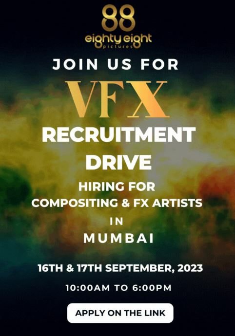 88 Pictures : 🌟 VFX Recruitment Drive 🌟 Yes, you read it right!! Callout to the talented VFX Compositors and FX Artists to join 88 Pictures VFX team and get an opportunity to work on amazing and creatively challenging projects. The Walk In Drive is scheduled on 16th and 17th September at our Mumbai Studio … Read more