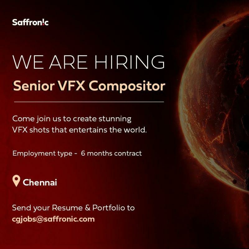 HIRING ALERT!! Saffronic is looking forward to hiring Senior VFX Compositors on 6 months contract basis. Immediate Joiners preferred. WFH option available. You can DM me for more details or mail your profile to muzaffar.shaik@saffronic.com