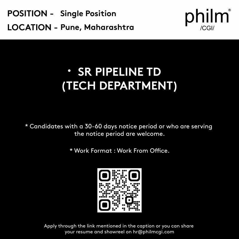 Come, be a part of Philmy Crew..!! We are Hiring! Position – Sr. Pipeline TD *Candidates with 30-60 days notice period or who are serving notice period are welcome. *Work Format : Work From Office *Work Location – Pune, Maharashtra To apply please fill this form – https://philmcgi.keka.com/careers/ Or share your resume and show-reel on hr@philmcgi.com