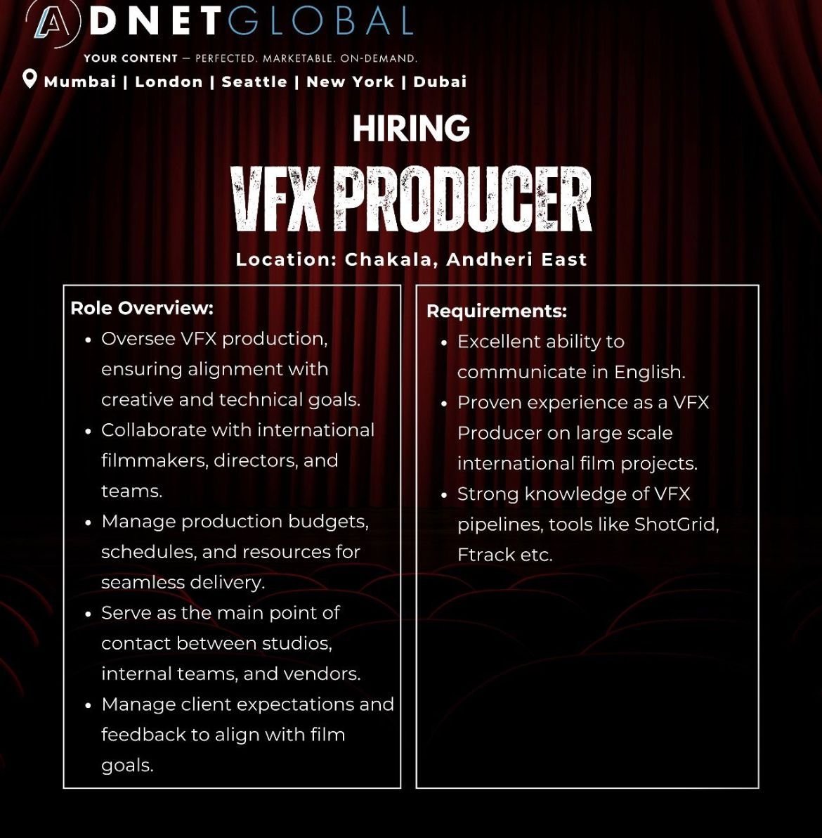 Adnet Global is looking for a VFX Producer to join our team and manage international film projects. If you have proven experience in global VFX production, strong analytical & organizational skills, we’d love to hear from you. 📍Location: Chakala, Anderi (E), India. Job Type: Work From Office and prefer candidates who can join immediately. Experience: … Read more