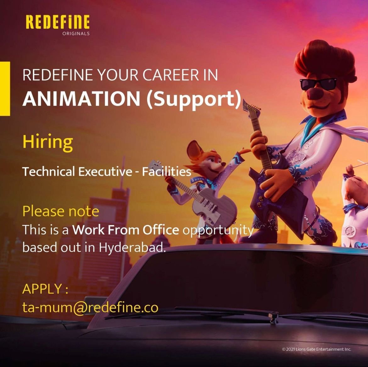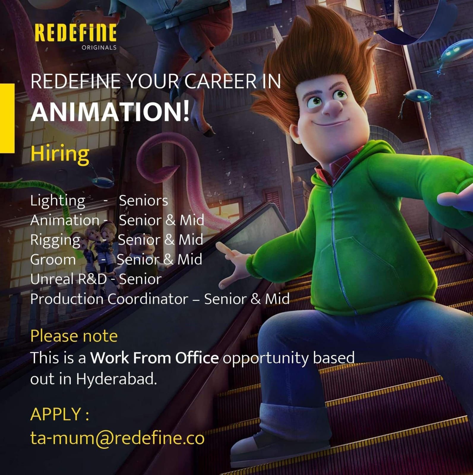 Join ReDefine Originals as a Technical Facilities Executive! Work from our Hyderabad office and be part of a dynamic team that supports the best in animation. Send your application to ta-mum@redefine.co!