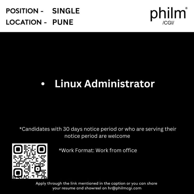 Come, be a part of Philmy Crew..!! We are Hiring! Position – Single Position Linux Administrator *Work Format : Work From Office *Work Location – Pune, Maharashtra To apply please fill this form – https://philmcgi.keka.com/careers/ Or share your profile on hr@philmcgi.com